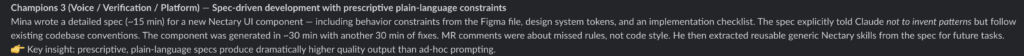 Result – a design system component generated in ~30 minutes, with another 30 minutes of fixes. MR review comments were about missed requirements, not code style. That’s a meaningful shift in where human attention goes during review.