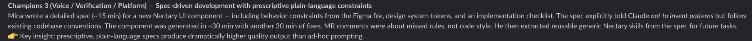 I used Claude Code to help build a new component for our design system. The approach was to write a plain-language prescriptive spec before touching any code. It covered behavior constraints, design tokens, implementation checklist, and then explicit instructions to follow existing codebase conventions rather than invent new patterns.